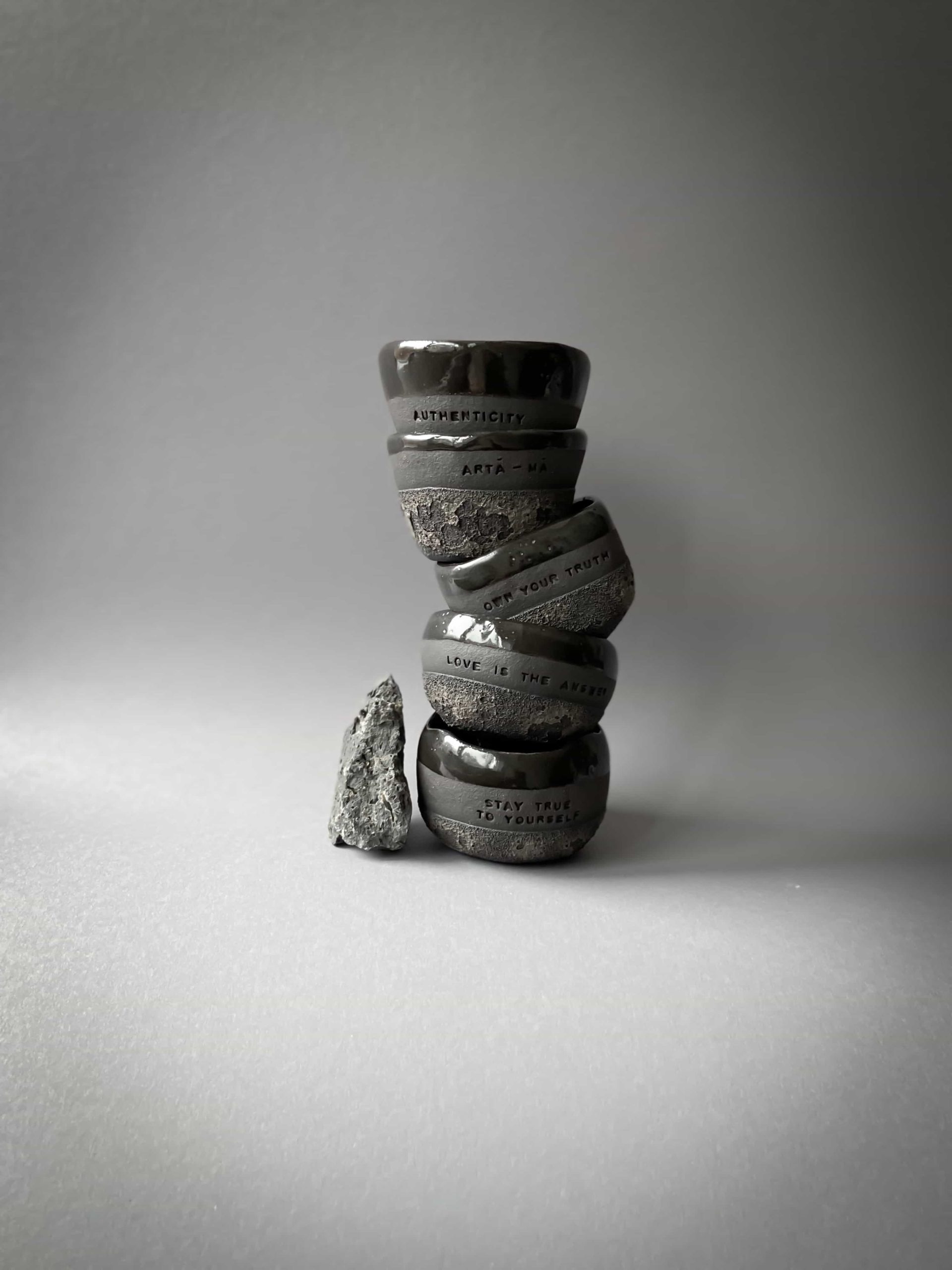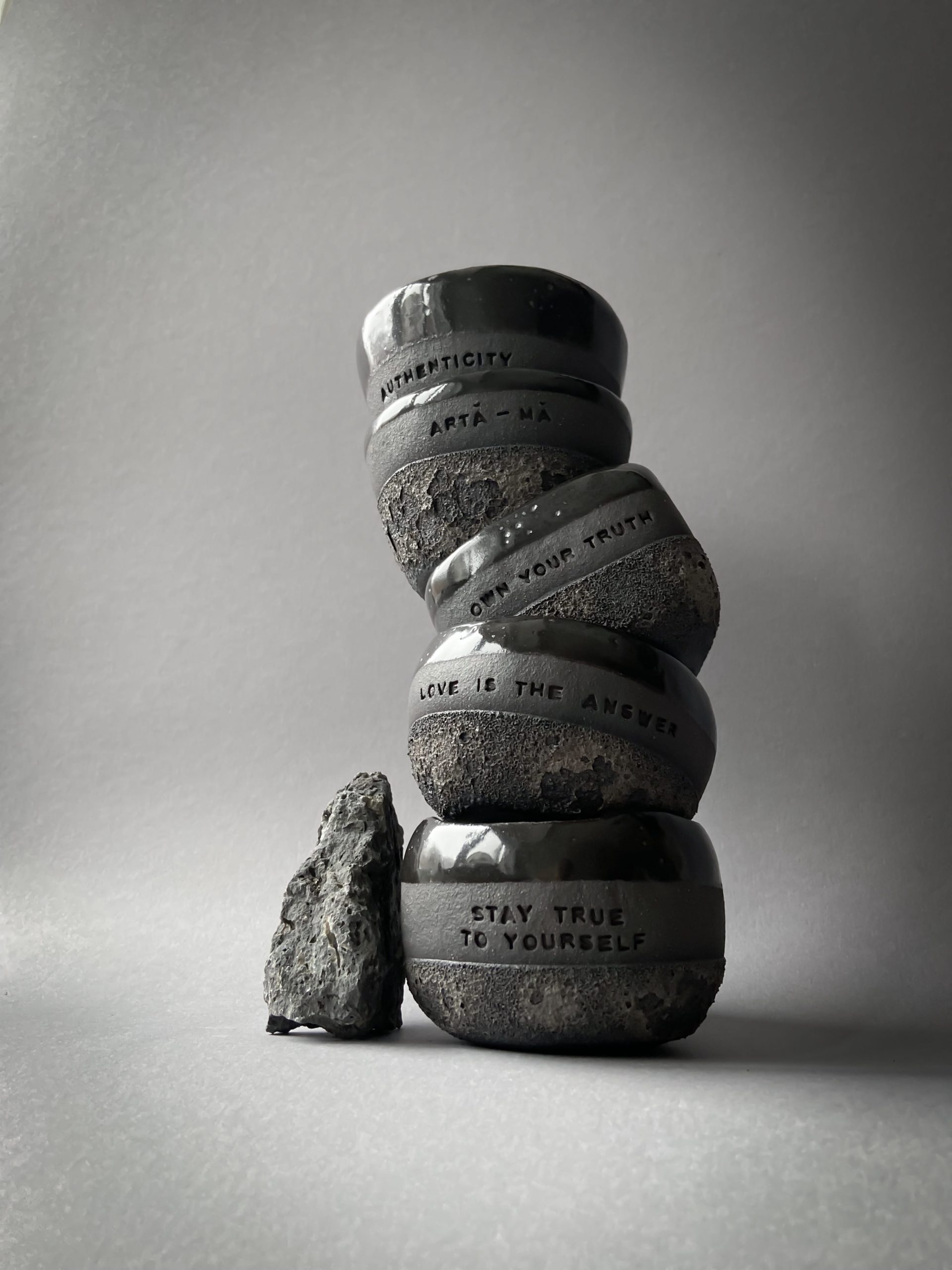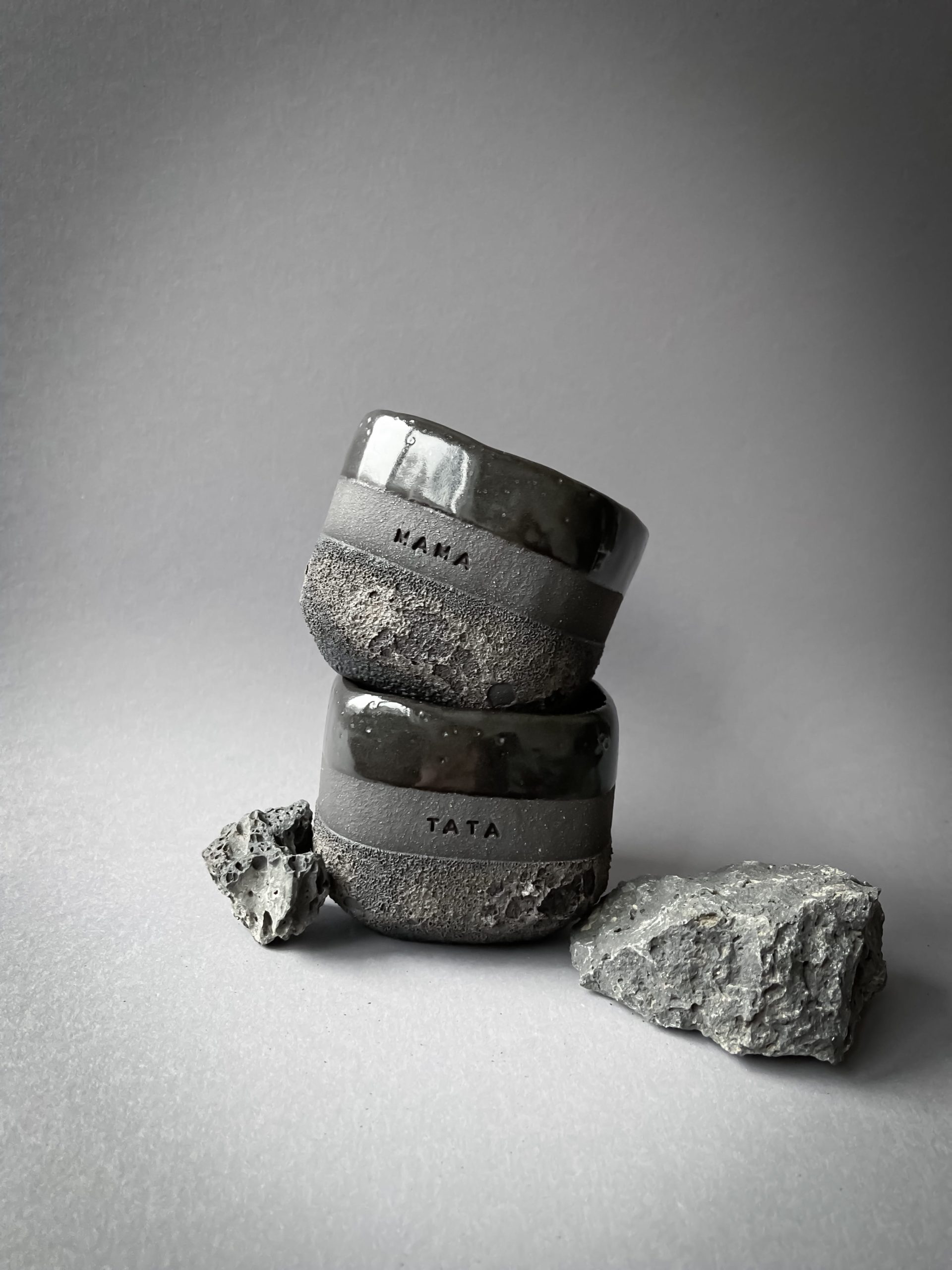 Două colecții în opoziție dar care se completează reciproc. Un duo de alb/negru care amintește că fiecare parte a vieții albă sau neagră face parte din viață. Iar viața e un întreg și le conține pe ambele. Au ca inspirație roca vulcanică, un mineral vechi, născut din foc, la fel ca aceste căni care au trecut și ele testul focului devenind puternice.